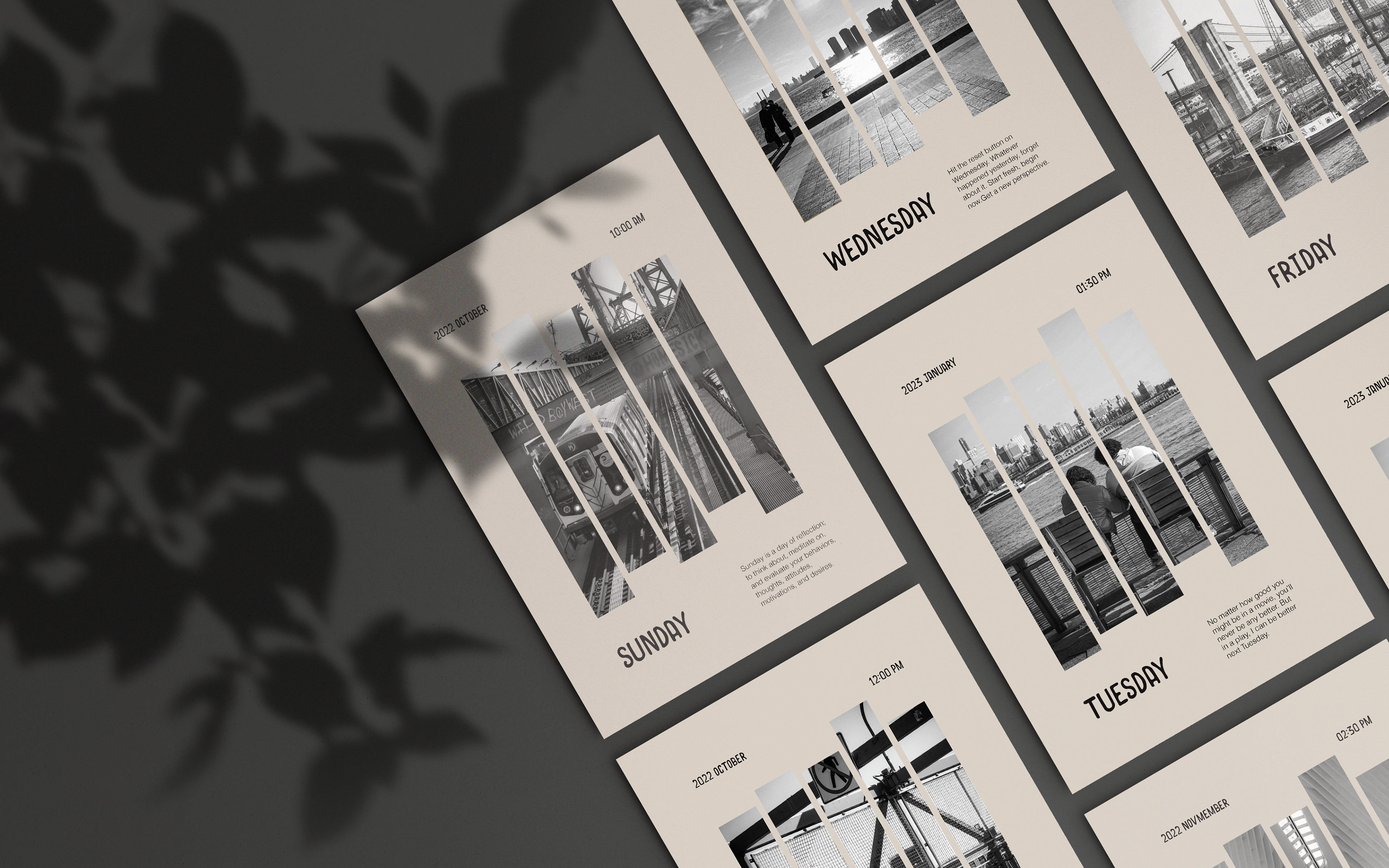 In this project, I design my self-promotion pieces, using my personal photography works to design a series of postcards. From Monday to Sunday, all include quotes that related to the days.